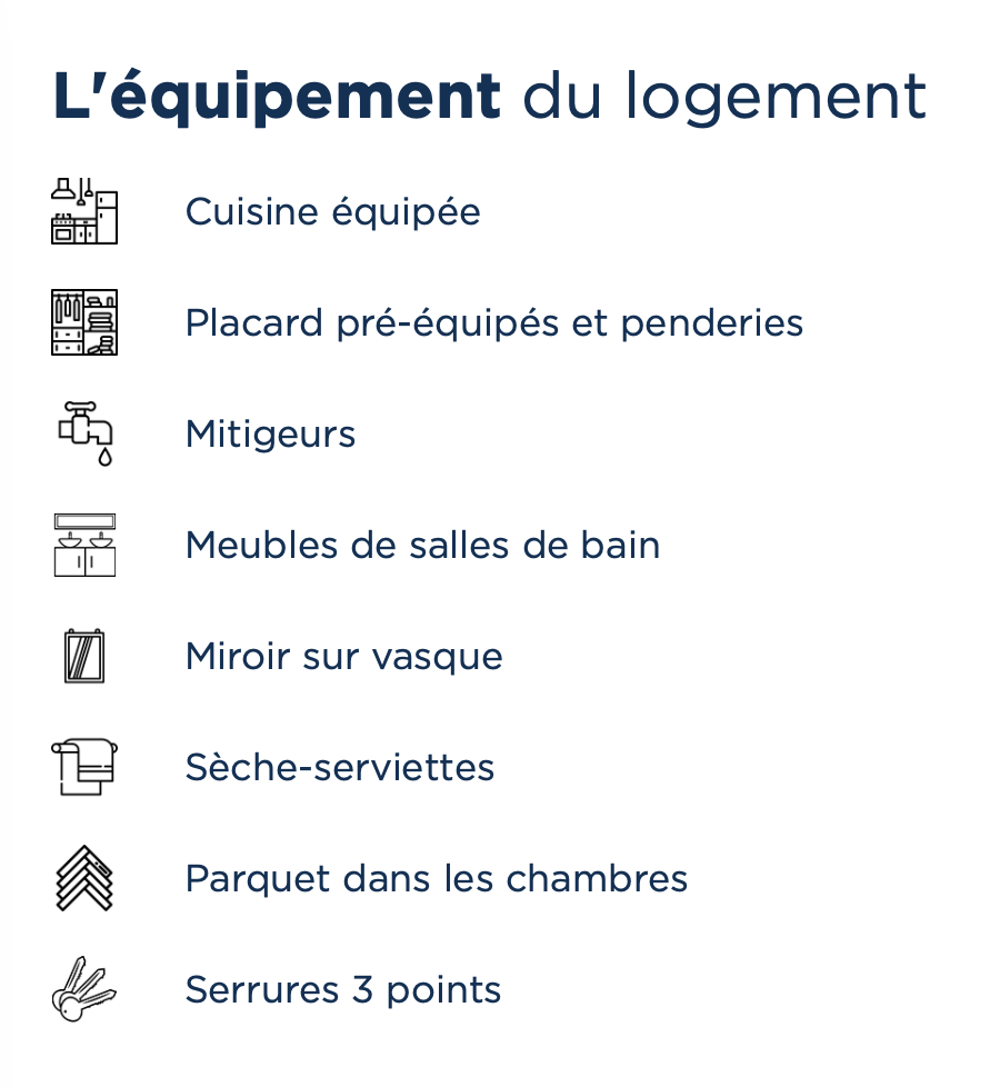 Le logement sera déjà équipé des éléments suivants: - Cuisine équipée - Placard pré-équipés et penderies - Mitigeurs - Meubles de salles de bain - Miroir sur vasque - Sèche-serviettes - Pompe à chaleur - Parquet dans les chambres - Serrures 3 points - Climatisation réversible - Interphone Vigik